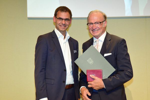 Der Bürgermeister von Lech, Ludwig Muxel (rechts), hat von Landeshauptmann Markus Wallner (links) das Silberne Ehrenzeichen des Landes erhalten. Er wird damit für seine Verdienste während seiner 25-jährigen Amtszeit geehrt. VLK