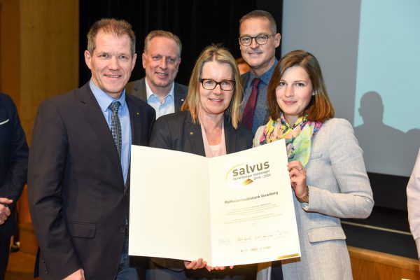 Bereits zum dritten Mal in Folge erhielt die Raiffeisenlandesbank Vorarlberg den salvus in Gold. Alle zwei Jahre zeichnen das Land Vorarlberg, die Wirtschaftskammer Vorarlberg, die Arbeiterkammer Vorarlberg sowie die Vorarlberger Gebietskrankenkasse die gesundheitsbewusstesten Betr
