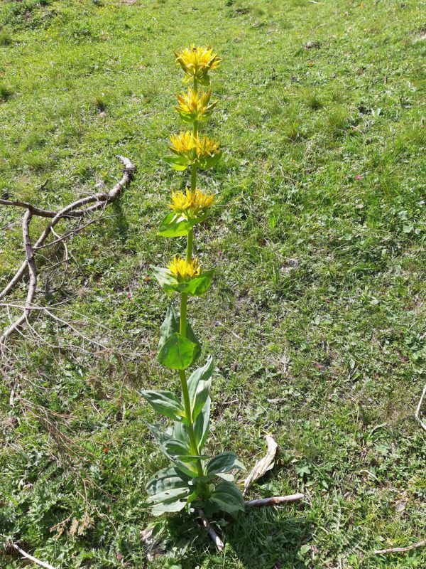 Gelber Enzian (Gentiana lutea): Er wächst bevorzugt auf Magerrasen der montanen und subalpinen Stufe und wird 50 bis 100 cm hoch. Er hat fleischig verdickte Speicherwurzeln, die reich an Zuckern (z.B. Gentiobiose) und an wertvollen Bitterstoffen (Gentianopicrin und Amarogentin) sind. Sie werden dahe