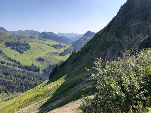 Am Furkajoch in einer Höhe von 1759 Metern überquert der Wanderer den Parkplatz und nimmt den Hangweg zum Serajöchle. Wild verwachsen überragen Erlen, Wacholder und kleine Tannen den schmalen Anstieg. Zum Pfrondhorn mit Seraspitz, den Wasserscheiden zwischen Frutz und Rhein, ragen hohe Felsenflanken