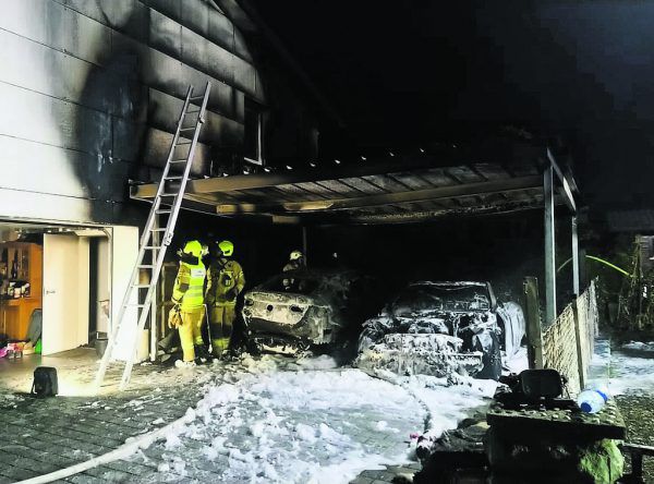 Vollständig zerstört wurden bei einem Brand in Altach zwei Pkw, die in einem Carport abgestellt waren. Das Feuer war in der Nacht auf Donnerstag aus noch ungeklärter Ursache ausgebrochen. Ein Bewohner des Hauses bemerkte gegen 2 Uhr den Brand und alarmierte die Einsatzkräfte. 40 Feue