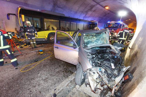 Lebensgefährlich verletzt wurde ein 18-jähriger Autofahrer am Sonntag bei einem Unfall im Stutztobeltunnel. Der junge Mann fuhr gegen 15.30 Uhr auf der Faschinastraße talwärts in Richtung Fontanella, als er im Tunnel über die Fahrbahnmitte geriet und einen entgegenkommenden Linienbus