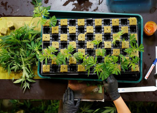 Junge Cannabis-Pflanzen werden in einem Gewächshaus des österreichischen Cannabis-Produzenten Flowery Field aufgezogen. Die Verantwortlichen des Unternehmens produziert etwa 25.000 Cannabis-Klone pro Woche und verkauft diese legal als Zierpflanzen.