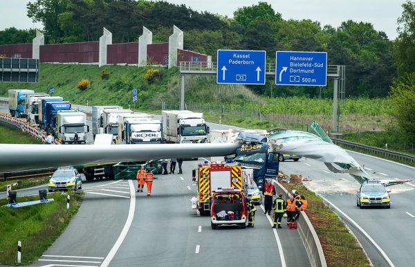 Unfall auf der A 33 bei Bielefeld: Ein Windradflügel der gerade per Schwertransport transportiert wurde bohrte sich durch das Führerhaus eines Lastwagens und blieb quer auf der Fahrbahn liegen. Zwei Lastwagenfahrer wurden leicht verletzt.