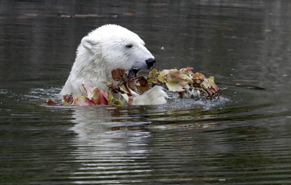 Ob das Essen von Herbstlaub der Schönheit dient, ist nicht bekannt. Dieser Eisbär ließ sich die bunten Blätter schmecken. Im Berliner Zoo genoss das Raubtier bei herbstlichen Temperaturen ein Bad im Pool. Eisbären sind vor dem Kamtschatkabären und dem Kodiakbären die größten an Lan