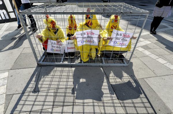 Aktivisten sitzen als Bodenhaltungshühner in einer Voliere am Stephansplatz in Wien. Mit der Aktion wollen die Beteiligten darauf aufmerksam machen, dass Bodenhaltung nicht immer für ein tiergerechtes Leben steht. APA