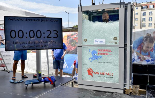 Eisschwimmer Josef Köberl hat am Samstag am Vorplatz des Wiener Hauptbahnhofes in einer Glaskabine voll Eis einen neuen Rekord aufgestellt. Nur mit Badehose bekleidet, hielt er es zwei Stunden, acht Minuten und 47 Sekunden in dem „Eisschrank“ aus. APA/HERBERT NEUBAUER