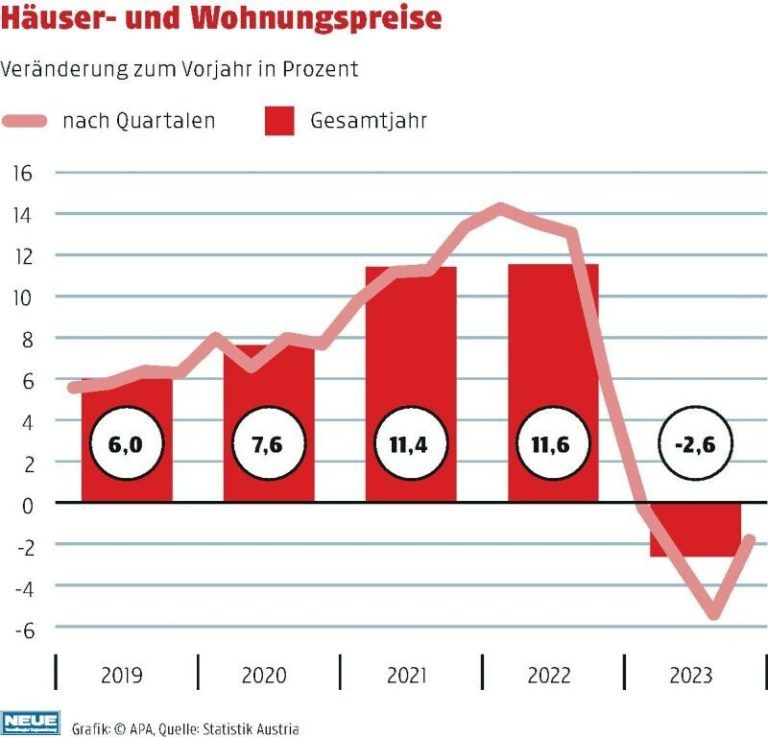 Der jahrelange Preisauftrieb bei Wohnimmobilien ist zu Ende. 2023 sanken die Kaufpreise von Häusern und Wohnungen im österreichweiten Schnitt um 2,6 Prozent, wie