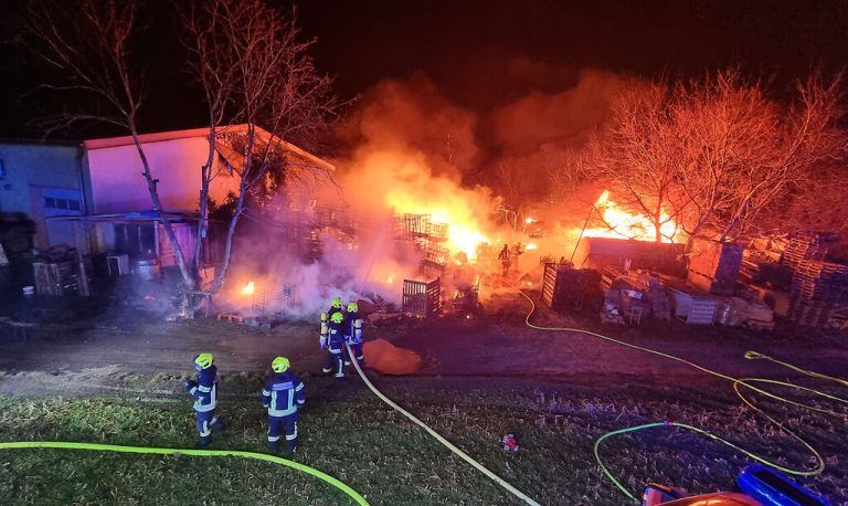 Heftige Windböen haben am Freitagabend einen Brand auf einem Lagerplatz in Tribuswinkel in der Stadtgemeinde Traiskirchen in Niederösterreich angefacht. Weil sich die Flammen auf dem Gelände rasant ausgebreitet hatten, waren sieben Feuerwehren mit fast 100 Mitgliedern ge