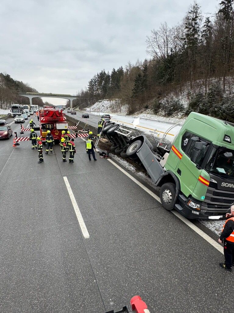 Ein mit 26 Tonnen Sonnenblumenöl beladener Lkw ist am Samstagvormittag auf der A1 umgekippt. Die Bergung gestaltete sich schwierig, weil der Hänger auf der Mittelleitwand liegen blieb, das Sonnenblumenöl musste aber nicht abgepumpt werden.