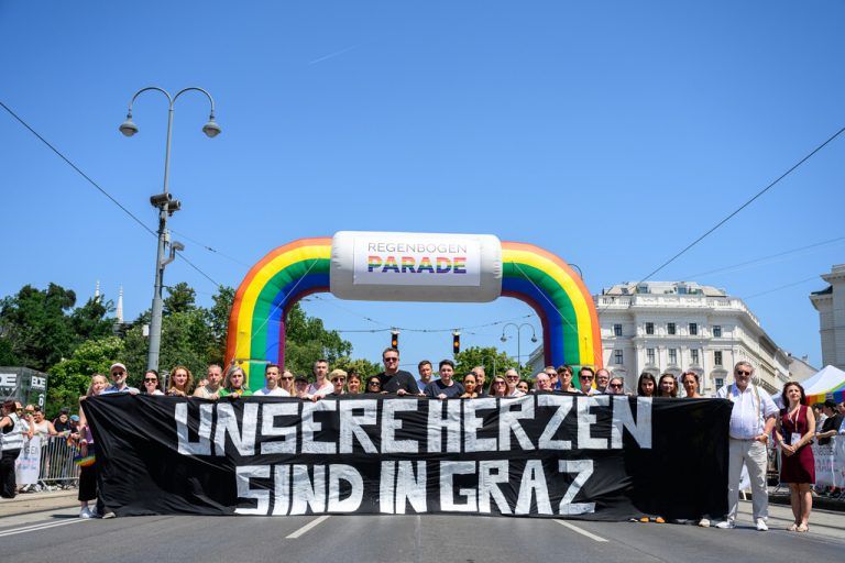 Hinter einem Banner mit der Aufschrift „Unsere Herzen sind in Graz“ ist am Samstag die Wiener Regenbogenparade gestartet. Um den Opfern des Amoklaufes zu gedenken, gingen die Teilnehmer vom Rathaus bis zum Parlament in einem Schweigemarsch. Insgesamt haben sich mehr als 300.000 Menschen bei der