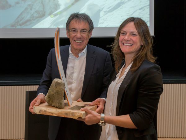 Freeride-Weltmeisterin Lorraine Huber wurde in Hohenems feierlich empfangen. Unter anderem überreichte der Mehrheitseigentümer ihres Austatters und Sponsor Kästle, Rudolf Knünz, der 37-Jährigen ein Präsent.