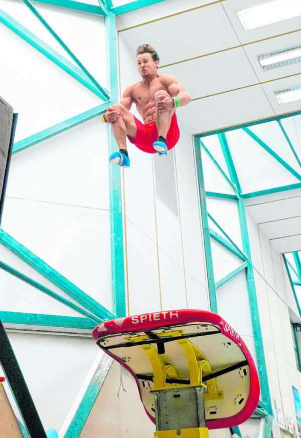Michael Fussenegger schließt kurz die Augen. Der Kopf ist nach unten gesenkt. Volle Konzentration. Der 24-Jährige steht 25 Meter vom Tisch entfernt. Er blickt auf, atmet kräftig aus und sprintet explosionsartig los. Wie aus der Pistole geschossen fliegt er förmlich dem Sprungbrett
