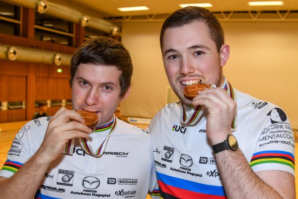 Markus Bröll (l.) und Patrick Schnetzer (r.) wurden in der Höchster Radlerhalle für ihren fünften gemeinsamen WM-Titel geehrt, den sie am Sonntag in Lüttich geholt hatten.