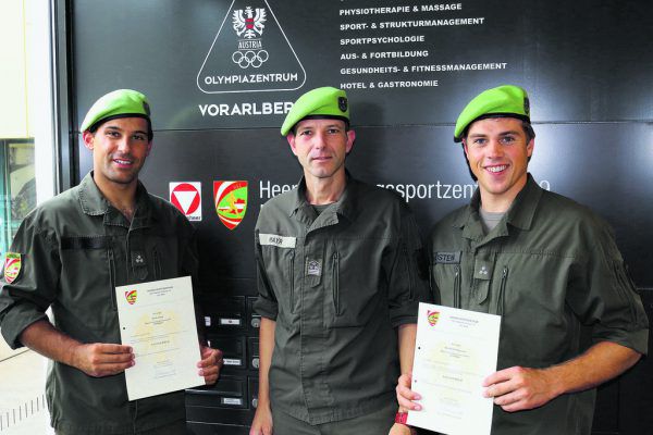 David Hussl (l.) und Benjamin Bildstein (r.) wurden gestern in den Rang des Zugführers erhoben. Die beiden Segler vom Yachtclub Bregenz erhielten vom stellvertretenden Kommandanten des Heeresleistungssportzentrums Vorarlberg Andreas Mayer (Mitte) die Ernennungsurkunde.