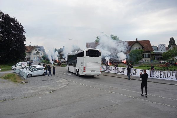 Die „Nordtribüne“ Lustenau bereitete dem Austria-Lustenau-Bus bei ihrer Abfahrt vom Planet-Pure-Stadion nach Klagenfurt eine gebührende Verabschiedung. Per Spruchband („Den Traum von 2011 vollenden – macht euch zu Legenden“) und Pyrofackeln grüßten die Fans bei ihrer Abreise.
