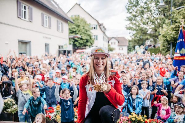 Bei der Weltmeisterschaft in Cortina strahlte der Stern der Katharina Liensberger heller als alle anderen. Die Göfnerin gewinnt Gold im Slalom, Gold im Parallelbewerb und Bronze im Riesentorlauf. Der Empfang in ihrer Heimatgemeinde Göfis fällt entsprechend euphorisch aus. Sams