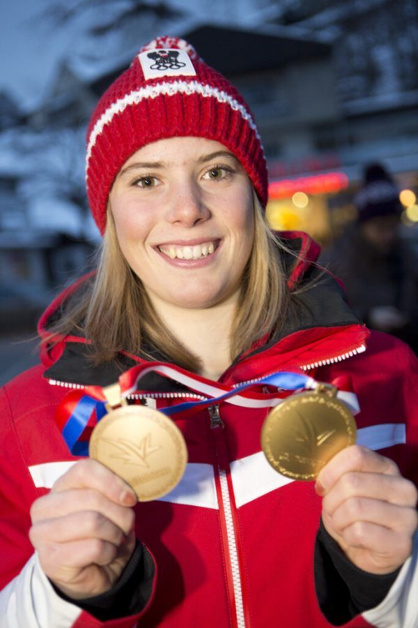 Beim Europäischen Olympischen Jugendfestival 2015 in Vorarlberg und Liechtenstein beweist Katharina Liensberger ein erstes Mal ihre Coolness. Die damals 17-Jährige holt im Riesentorlauf die Bronzemedaille, zum Abschluss gibt’s als Krönung die Goldmedaille im Teambewerb. Archiv/Hartinger