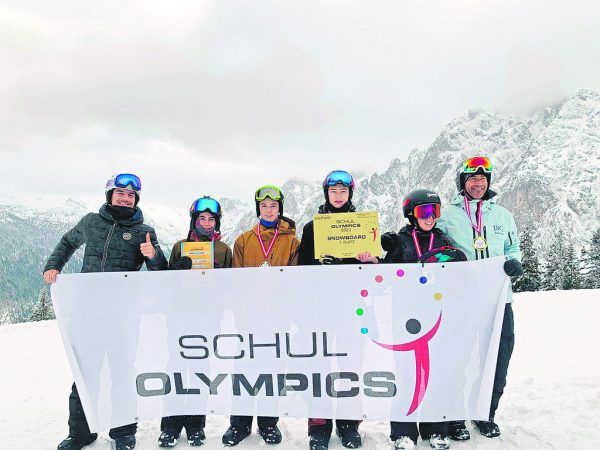 Das Team der SMS Nüziders hat in Gosau am Dachstein gestern in der Unterstufe Knaben sensationell den Bundesmeistertitel Schul Olympics Snowboard gewonnen. Die Walgauer waren in beiden Durchgängen die Schnellsten. Von links: Leo Mock, Valentin Muther, Noah Burtscher, Iva