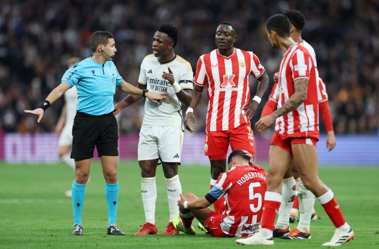 Real Madrid hat mit Mühe und dank mehrerer fragwürdiger VAR-Entscheidungen eine peinliche Heim-Niederlage verhindert und durch einen sehr späten 3:2 (0:2)-Sieg gegen den Tabellenletzten UD Almeria die Tabellenführung zurückgeholt. Bei Almeria sagte Gonzalo Melero: „
