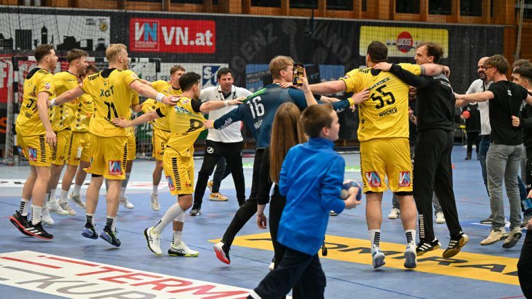 Spielbericht. 1600 Fans feiern mit ihrem Team nach 33:30-Sieg gegen UHK Krems den Aufstieg ins Viertelfinale des EHF European Cups. Tormann Häusle erneut bärenstark.
