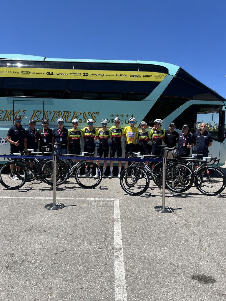 Die gesamte Mannschaft vom Team Vorarlberg vor dem Start der zweiten Etappe in Santarem. Nach dieser Aufnahme lautete die Mission: Gelb verteidigen. Einigen war bei der Aufnahme des Fotos des Tages die Anspannung ins Gesicht geschrieben, andere waren locker