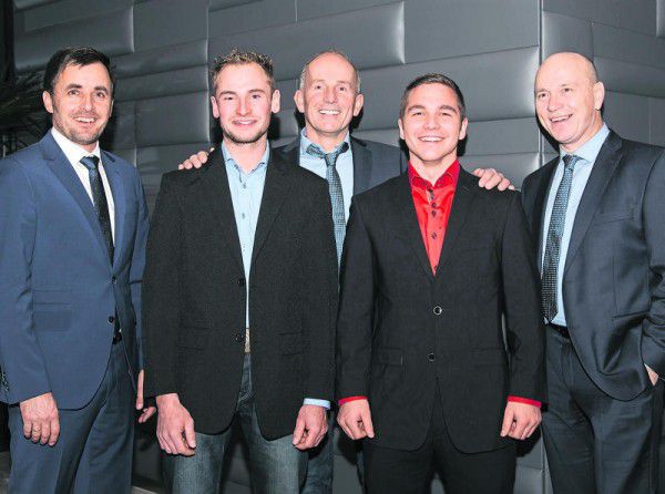 Markus Geist (2. v.l.) und Martin Hartmann (4. v.l.) belegten bei der Dachdecker-Weltmeisterschaft der IFD (Internationale Föderation für das Dachdeckerhandwerk) im polnischen Warschau in der Kategorie Steildach (Teambewerb) den dritten Platz. Als erfolgreicher Mentor stand Martin