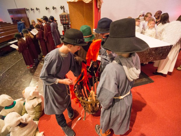 Im Altarraum steht ein Korb, gefüllt mit Holz. Um diesen herum vier kleine Hirten. Die Hüte, bisweilen etwas zu groß, tief ins Gesicht gerückt. In den Händen halten sie rote Bänder, die die Flammen eines kleinen Feuers symbolisieren sollen. Der Hirtenchor singt „Schalom, sch