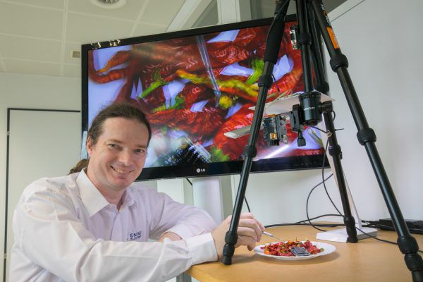 Der „Versuchsaufbau“ ist einfach gehalten: ein Teller mit getrockneten Chili-Schoten darauf, eine kleine elektronische Leiterplatte zwischen den roten Winzlingen sowie ein Zahnarzt-Instrument. Auf einem Stativ sind darüber zwei Kameras angebracht und eine Computerplatine. Dah