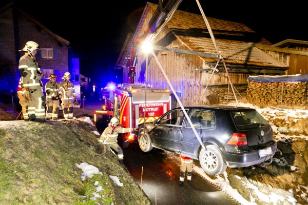 Eigentlich wollte der Lenker dieses Wagens nur noch einmal umparkieren, Dabei kam das Auto von der Straße ab und blieb auf einer Böschung hängen. Die Insassen mussten im Auto sitzenbleiben, bis die Feuerwehr das Fahrzeug gesichert hatte. Danach wurde das Fahrzeug mit einem Kran gebor
