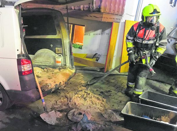 Zu einem Brand mussten in der Nacht auf Mittwoch die Einsatzkräfte der Feuerwehr Satteins ausrücken. Stoffreste, die mit Bodenöl getränkt waren, hatten in einem bei einem Wohnhaus geparkten Firmenwagen Feuer gefangen und eine Werkzeugkiste sowie einen Sack mit Sägemehl in Brand g