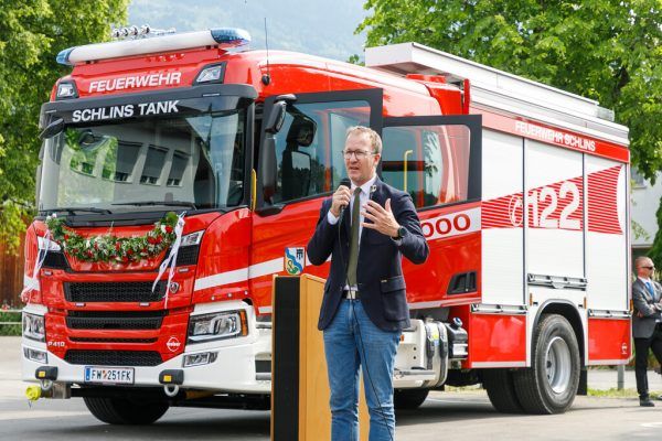 In Schlins ist am Sonntag ein neues Tanklöschfahrzeug der Feuerwehr gesegnet worden. Es fasst 1000 Liter Wasser und verfügt über einen 100 Liter großen Schaumtank. „Mit dem neuen leistungsfähigen Fahrzeug sind wir für zahlreiche Anforderungen bestens gerüstet“, so Feuerwehrkommandant Lukas Amann. D