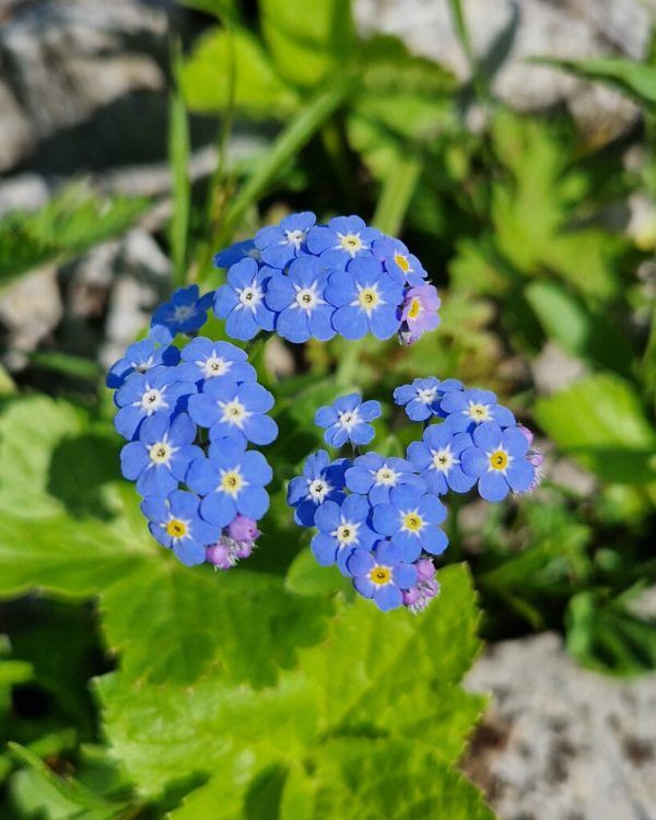 Das Alpen-Vergissmeinnicht (Myosotis alpestris) aus der Familie der Raublatt- oder Borretschgewächse kommt in Bergwiesen und Geröllfluren bis auf 3000 Meter Höhe vor. Es wird circa fünf bis fünfzehn Zentimeter hoch, Stängel und Blätter sind rau behaart. Es blüht von Juni bis August in kräftigem Himm