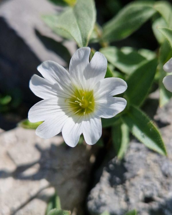 Das Alpen-Hornkraut (Cerastium alpinum) aus der Familie der Nelkengewächse kommt auf Geröllfluren, in Felsspalten und auf Gratrücken bis auf circa 2800 Metern Höhe vor. Es wird circa 5 bis 20 Zentimeter hoch, Stängel und gegenständige Laubblätter sind rau behaart. Es ist eine ausdauernde krautige Pf