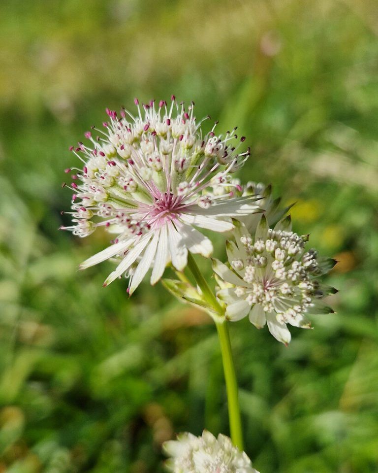 Die Große Sterndolde (Astrantia Major) wird circa 30 bis 90 Zentimeter hoch, blüht von Juni bis August und kommt im Gebirge auf kalkhaltigen Böden oder Bergwiesen vor. Der Blattstiel ist fein gerillt und hohl. In den Dolden stehen männliche, weibliche und zwittrige Blüten. Die Frucht ist dicht g