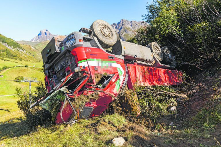 Als ein 21-jähriger Mann aus dem Bregenzerwald am Montag gegen 9 Uhr einen Lkw mit Aushubmaterial bergwärts von Oberlech in Richtung Bergstation Weibermahdbahn fuhr, kam er auf dem nichtasphaltierten Güterweg zu weit nach rechts. Der rechte Fahrbahnrand gab nach, das F