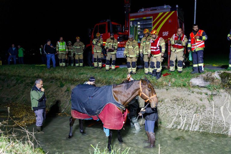 Gegen 18 Uhr am Sonntag war in Schlins eine Reiterin mit ihrem Pferd unterwegs, als das Zaumzeug riss. Die Frau stieg ab, woraufhin das Pferd davongaloppierte und in den Gießenbach stürzte. Die Feuerwehr holte das Tier per Kran heraus. hofmeister