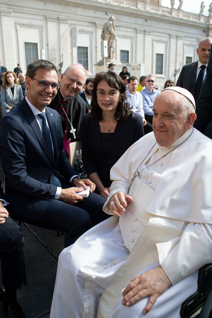 Am Rande einer Generalaudienz trafen Landeshauptmann Markus Wallner und Ehefrau Sonja Wallner am 3. Mai auf dem Petersplatz in Rom Papst Franziskus. Mit dabei war auch Bischof Benno Elbs, der sein zehnjähriges Bischofsjubiläum feierte. Vatican Media