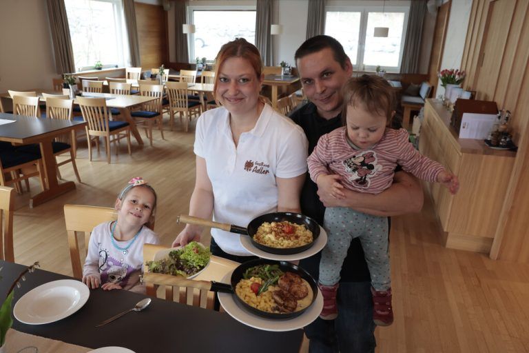 Inhaber Thomas della Schiava bietet in Langen bei Bregenz traditionelle Speisen an. Spezialität des Hauses ist die „Adler-Pfanne“.