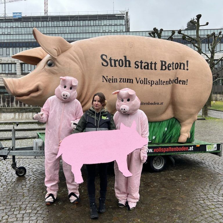 Tierschützer vom Verein gegen Tierfabriken (VGT) haben mit „Grunzi“, einem riesigen künstlichen Schwein auf einem Anhänger, vor dem Landhaus in Bregenz gegen Missstände in der Schweinehaltung protestiert. Sie forderten ein baldiges Verbot der Schweinehaltung auf Vollspalten