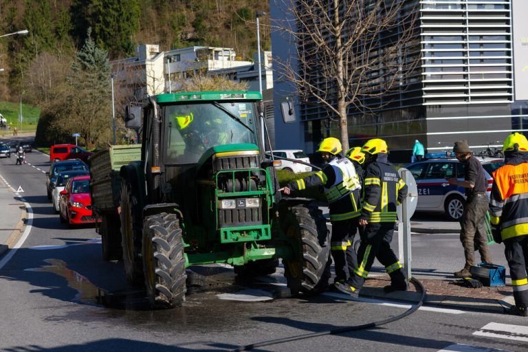 Bei Kronhalden in Bregenz geriet ein Traktor auf der Straße in Brand. Laut ersten Informationen ist der Hydraulikschlauch geplatzt und die Hydraulikflüssigkeit fing Feuer. Laut Polizei konnte der Traktorlenker den Brand aber selbst rasch löschen.