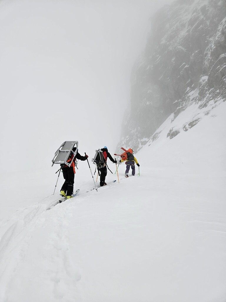 Mit einer komplizierten Aktion haben Einsatzkräfte eine verletzte Deutsche am Samstag aus den Alpen gerettet. Weil drei unterschiedliche Helikopter alle nicht am Unfallort landen konnten, musste die 58-Jährige, die sich bei einer Skitour am Bein verletzt hatte, zunächst mit einem Rettungsschlit