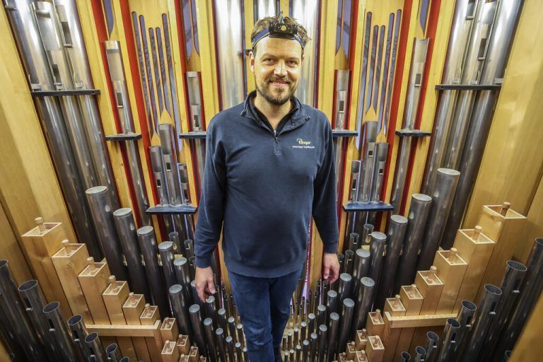 In der Schwarzacher Kirche überholen Michael Fritsch und sein Team die Rieger-Orgel. Dabei gewährten sie der NEUE Einblicke in die Arbeiten.