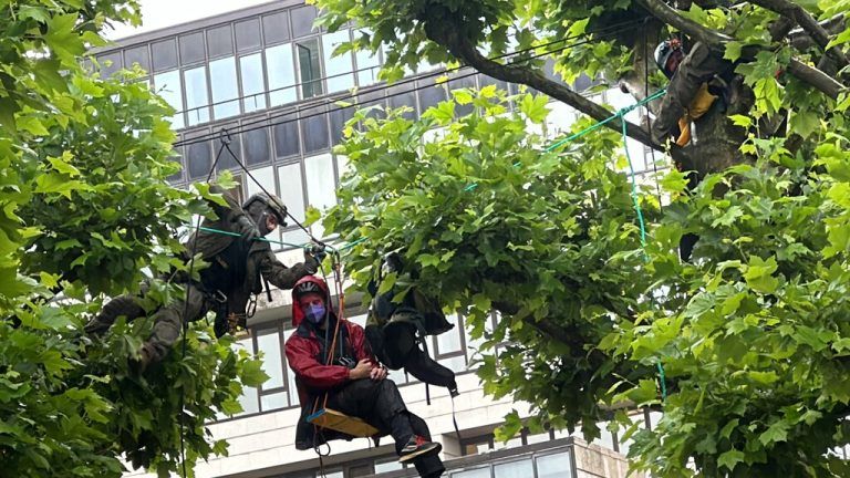 Die Exekutive löste gestern eine Protestaktion vor dem Landhaus auf. Nachdem zwölf Aktivisten der Klimaschutzbewegung „Extinction Rebellion“ in Zelten vor dem Landhaus übernachtet hatten, fixierten sie sich gestern gegen 5.20 Uhr an Holzbauteilen und in Baumkronen. Auf