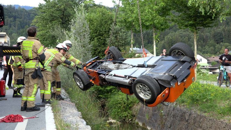 Am Mittwochabend ist in Dornbirn ein Sportwagen in das Bachbett des Küferbachs gestürzt. Der Fahrer kam gegen 20.30 Uhr aus unbekannter Ursache von der Straße ab und landete mit seinem auf dem Dach liegenden Fahrzeug im Bach. Die Feuerwehr musste das Auto bergen. Der Lenker