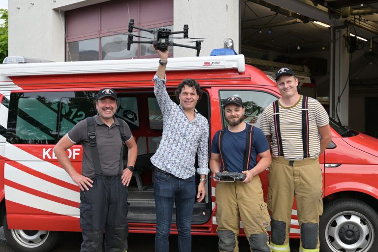Eine neue Drohne hat es kürzlich für die Feuerwehr Feldkirch-Nofels gegeben. Bürgermeister Manfred Rädler (2.v.l.) war bei der Übergabe an die Feuerwehrleute mit von der Partie. Das neue Fluggerät ist mit einer Wärmebildkamera ausgestattet und besonders bei Sucheinsät