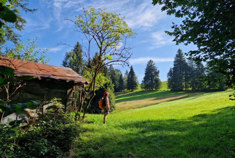 Auf Wiesen- und Waldwegen geht es hinauf zum Bergrücken, wo man entlang der Landesgrenze aufs Kojenmoos blickt, ehe der Abstieg durchs steinerne Tor beginnt.