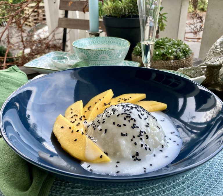 Währenddessen Kokosmilch mit Zucker und Salz erhitzen. Etwas Speisestärke in kaltem Wasser an