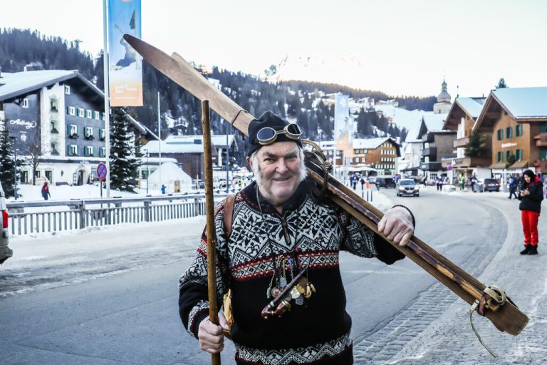 Einmal im Jahr zieht Robert Pfister (80) in Lech am Arlberg alle Blicke auf sich – mit seinem Retro-Outfit und alten Holzski.
