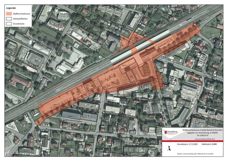 Die Bezirkshauptmannschaft Dornbirn erlässt eine Waffenverbotszone im Umfeld des Bahnhofs Dornbirn. „Mit dieser Maßnahme wollen wir die Sicherheit der Bevölkerung am Bahnhof wei